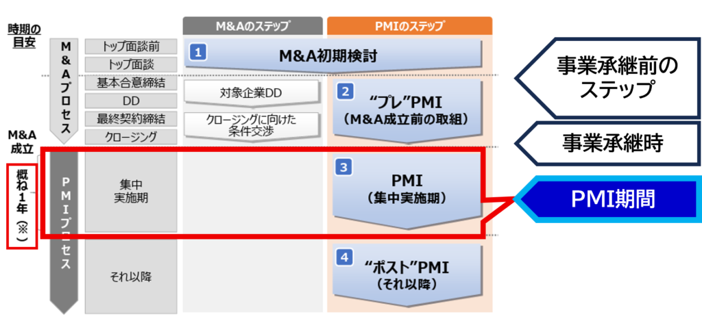 【出典】中小企業庁「中小PMIガイドライン~中小M&Aを成功に導くために~」P.18 <PMIプロセスの位置づけ>より筆者再編